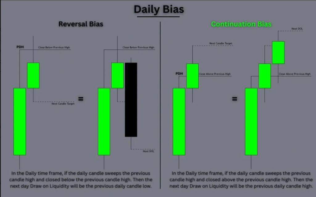 Reversal Bias: When the daily candle sweeps the previous day’s high (PDH) but closes below it, the next day’s target